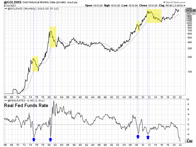 One measure of real rates is the real Fed Funds rate (FFR). Subtract the FFR from the rate of inflation. This is somewhat of a lagging indicator, but it’s historically accurate.
