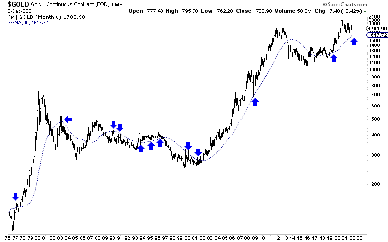 Here we plot Gold’s weekly line chart with an equivalent moving average (to the 40-month).