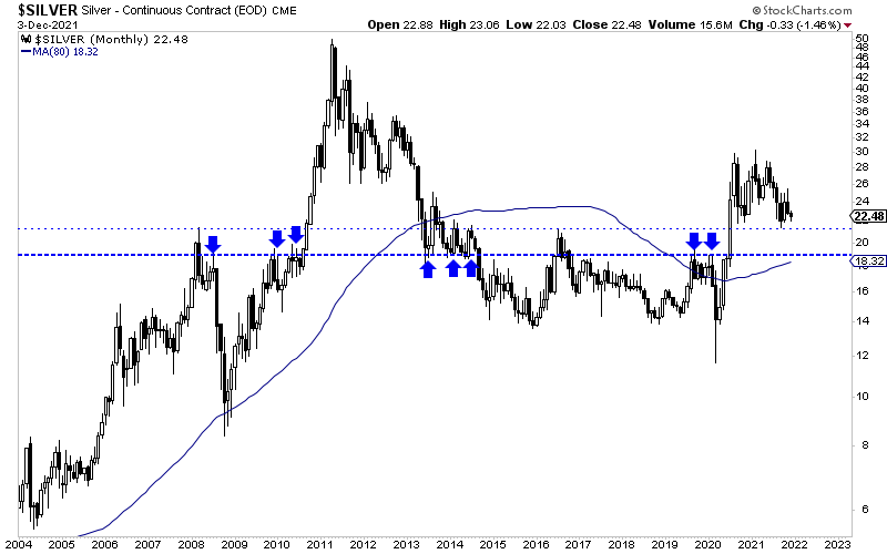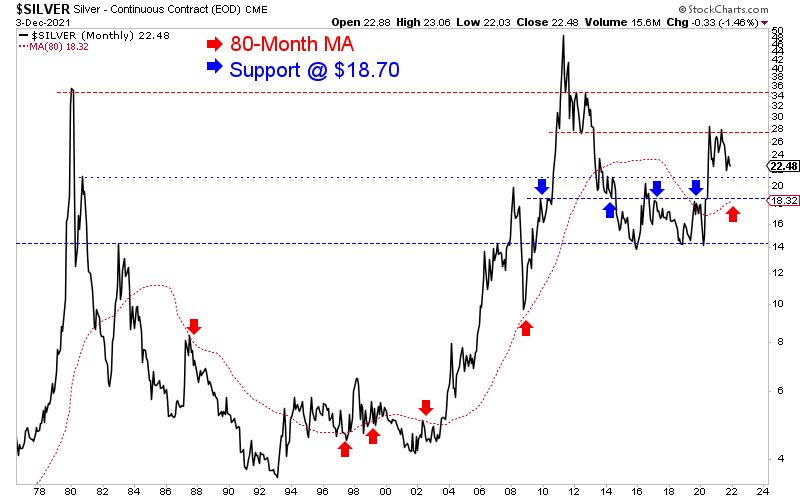 The monthly line chart for Silver shows key support at $21 and strong support at $18.70. The 62% retracement from the 1993 low and 2011 high is $21. The 80-month moving average for Silver should reach $18.70 in 2022.
