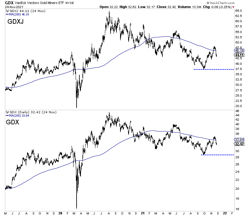 Turning to the miners, we see they remain in a downtrend as the rally has reversed below the 200-day moving averages.