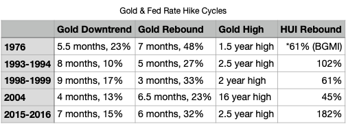 Over the past 60 years, the Fed has embarked on eight rate hike cycles. During five of the eight, Gold rebounded around the hike, while once (1993-1994) Gold rebounded months ahead of the hike. (The other two are irrelevant to today because Gold rebounded sharply before the rate hikes).