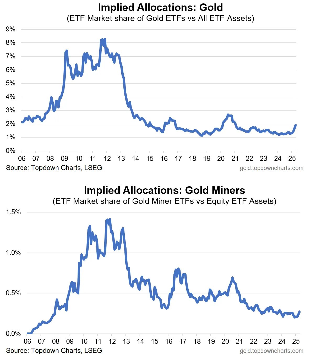 The charts below show the implied allocations (via ETFs) to Gold and Gold Miners. Allocations have only just begun to move off multi-decade lows.