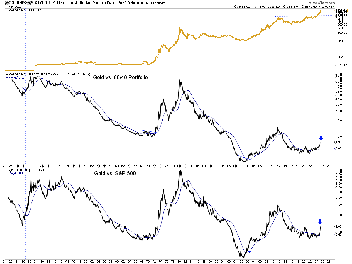The previous secular bull markets in Gold and precious metals were confirmed when Gold broke out against the 60/40 Portfolio. It broke out of a base and exploded above the 40-month moving average.