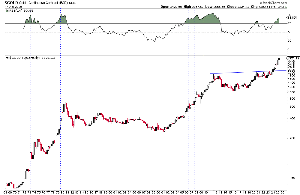 The quarter just started, but if Gold were to close at this level, it would compare to similar RSI readings at peaks in 1973, 1979, 2006, late 2007, and 2009.