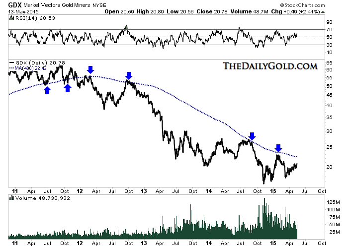 Forget the 200-day moving average. While it is important, clearly the 400-day moving average has been a much better indicator for the gold miners.