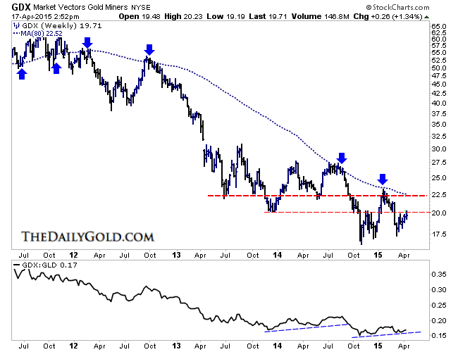 The bear market in precious metals is essentially four years old and a change is soon to be at hand. The question is will it end through a slow transition in the months ahead or will it end soon after Gold loses $1150 and plunges below $1100? Either scenario presents an opportunity. If Gold breaks lower, that would ultimately provide an excellent buying opportunity. If the miners can rally up to the 80-week moving average then that would indicate the sector is in gradual transition from bear to bull. In either case, traders and investors will need to have some patience. Consider learning more about our premium service including our current favorite junior miners which we expect to outperform in the second half of 2015.