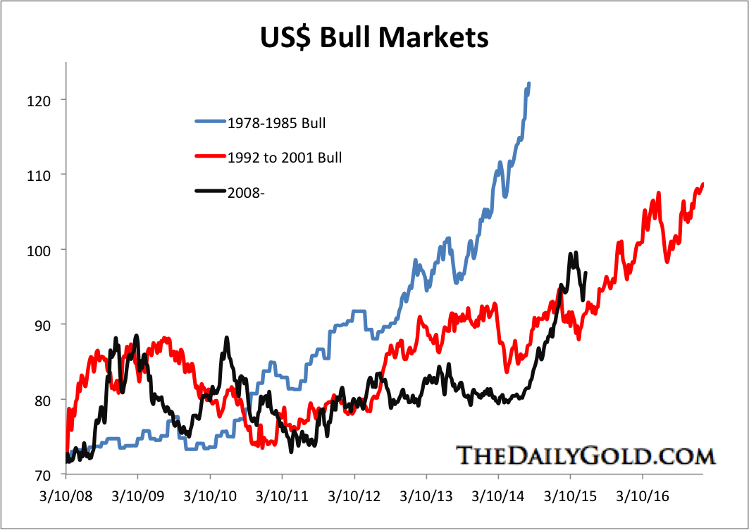 Another reason Gold likely has more downside ahead is the US$ bull market may not be finished. While Gold has held in very well with the rising US$, it failed to rally when the US$ corrected from 100 to 93. If the US$ had put in a major top then precious metals would have surged. This chart argues that the US$ has another push to the upside before it makes a major peak.