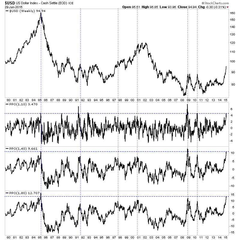 Let’s take a look at the US$ index. We plot the index and its distance from its 10, 40 and 80-week exponential moving averages. A market’s distance from various moving averages can signal overbought and oversold conditions. We highlight the points at which the US$ index has been most overbought. Considering the three oscillators as a whole, the US$ index is arguably at its third most overbought point since the US$ floated in 1971. The other times were at its peak in early 1985 and during the 2008 financial crisis.