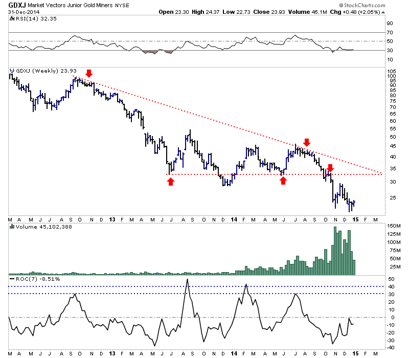 Below is a weekly bar chart of GDXJ. Note the confluence of trendline and lateral resistance just below $33. The 50% retracement of the recent 53% decline (June to December) is $33. Clearly $33 figures to be important overhead resistance. GDXJ closed Wednesday pennies below $24.