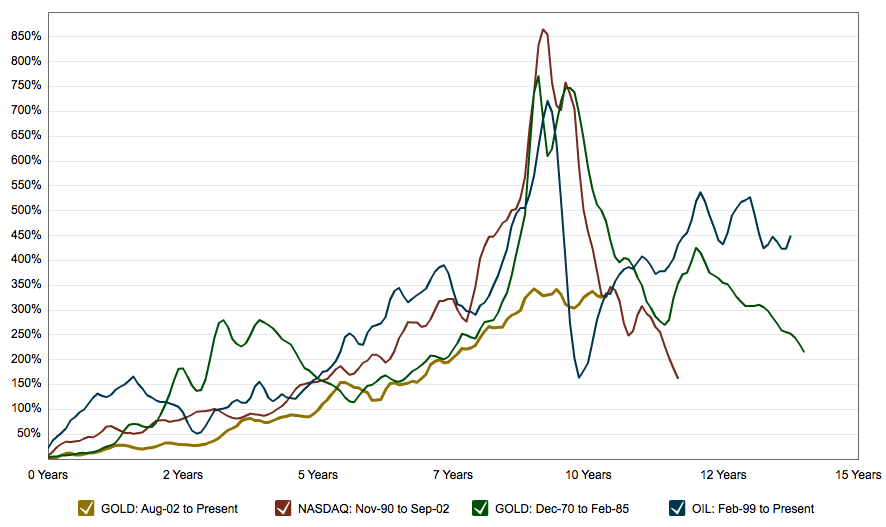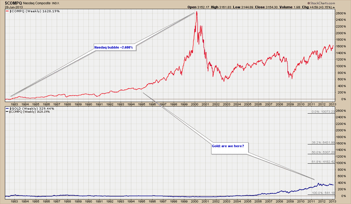 Simone Alberizzi shows in his chart that for Gold to mimic the Nasdaq euphoric of the late 1990s, it would have to reach over $10,000 per ounce. Considering this historical data, we can see that during the secular stock bull market of 1982-2000, Nasdaq managed to achieve a return of 26 times its value. Also consider that during the 1970s and into January of 1980, Gold also managed to return more than 23 times its value. When one compares those astronomical moves to the current bull market, hopefully we all come to a conclusion that we still have a long way to go.