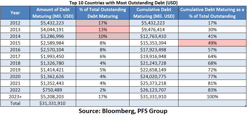 “Looking at the outstanding debt for the top 10 combined shows that just between now and the end of the year more than $5 trillion in debt will mature, or 17% of their total outstanding debt, and by 2015 nearly 50% of the top 10 debtor nations total outstanding debt will come due. That is more than $15 trillion in debt coming due in the next two and half years!