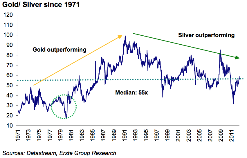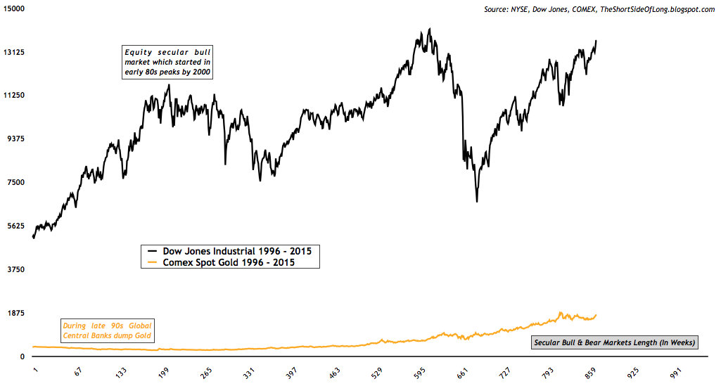 Moving away from Gold’s valuation linked with the monetary base, we turn to valuing Gold relative to other financial assets such as stocks. Personally, this is a much more preferred measure, because market participants buy and sell these assets everyday (free market). In the chart above, we can see how Gold and the Dow Jones Industrial performed in nominal price during the 1970s. While equities stayed flat for more than a decade, Gold entered a “mania phase” in the latter parts of the 1970s and then went parabolic into 1979, and finally touching the nominal value of the Dow Jones in the early parts of 1980.