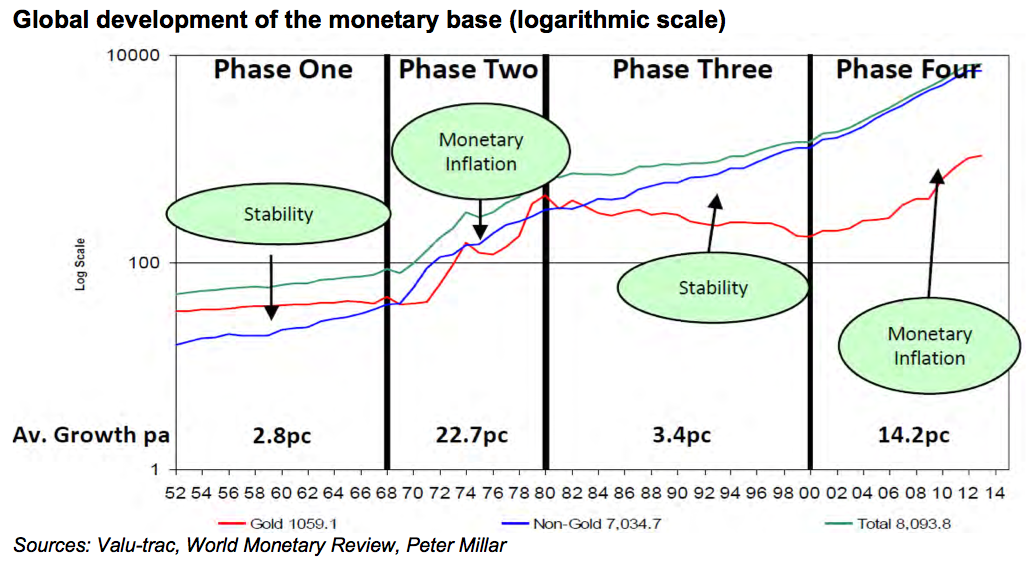 Interestingly, not only Mr Puplava, but quite a few other wise investors talk about Gold’s “mania phase” as the main reason they continue to stay long this asset class. Basically, to simplify the theory and eliminate a lot of when, why and what, we are currently in an inflationary monetary phase, as opposed to a stabilising monetary phase (chart above). What usually occurs during monetary inflation (fancy world for currency devaluation) is that Gold tends to move rapidly higher in value until it reaches a price where it essentially backs the monetary system. This historical phenomena which occurred in 1933 and in 1979, is created through investor fear, a primary component of human emotion which tends to spike Gold prices towards dizzying heights. Based on the monetary expansion by central banks, if Gold was to back the system as of today, the price would essentially rise towards $8,000 per ounce.