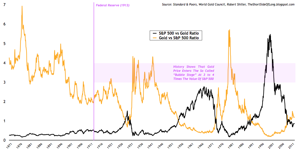 Another way to value Gold relative to the stock market is comparing the ratio of S&P 500 and Gold. Because most investors only look at one side of the ratio, S&P 500 vs Gold (black line), they easily arrive at a conclusion that stocks are extremely cheap relative to Gold as of today, and therefore Gold must be extremely expensive. This could not be further from the truth. Since every story has two sides, one cannot just focus on one and disregard the other. By simply switching the ratio over to Gold vs S&P 500 (gold line), we can see that Gold is extremely undervalued relative to the S&P 500. Overvaluation tends to occur when Gold trades at 3 to 4 times the value of the S&P 500, however in 1979/80 mania it went as far as 6 times the value. Today, the S&P 500 trades at 1,460 so even if stocks were to experience a 30% bear market (as already stated above), Gold could move towards $4,000 per ounce. Higher targets could occur if the ratio was to move to 6 times or more.