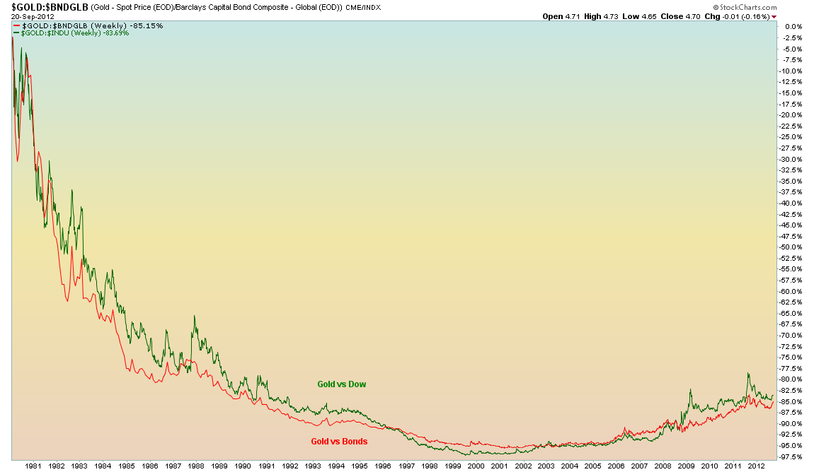 However, stocks are not the only overvalued asset class, relative to the last Gold peak in 1980. Bonds, which have experienced a super powerful secular bull market since 1981, are also extremely overvalued relative to Gold (even more so than stocks). The chart above shows just how cheap Gold is relative to its 1980 nominal ratio against Stocks and Bonds. If you are a believer that Gold will spike back to its former glory days of the late 1970s, then in percentage terms Gold is still more than 80% below its ratio all time high. That is still extremely cheap, despite Gold rising 500% in the last 11 years!