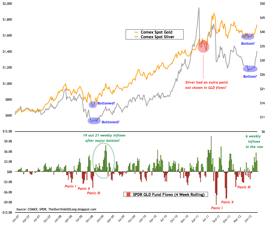 Having said, we could have also witnessed a major low in the PMs sector, like die hard Gold bugs believe (they believe every sell off is a major low). Assuming this is true and the cyclical bear market has finally finished, similarities could be drawn back to October and November 2008 prior to the Central Bank reflation policies, where we saw consistent inflows for 19 out of 21 weeks. I do have to admit that Precious Metals find themselves in a seasonality positive period of the year and therefore could surprise further to the upside, after a near term consolation or correction.