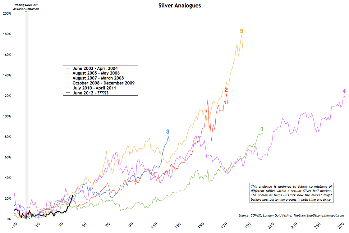 In that case scenario, the best Precious Metals play tends to be Silver, as it behaves like Gold on steroids (very high beta). Over the last decade or so, during the Precious Metals secular bull market, Silver has experienced five major rallies out of technical bottoms. Assuming we have seen another major low, as Ben and Mario begin reflating, Silver might follow the historically strong seasonality period over the Summer months towards next years Spring months. The chart above shows Silver’s analogue taking into context those five periods, while tracking the recent rally breakout, which started in late June at $26. Using a basic mathematical averaging method, if the rally follows historical patterns, it could last up to 160 to 190 trading days and gain more than 80 to 90 precent. That would put Silver back towards testing its major resistance level at $50.