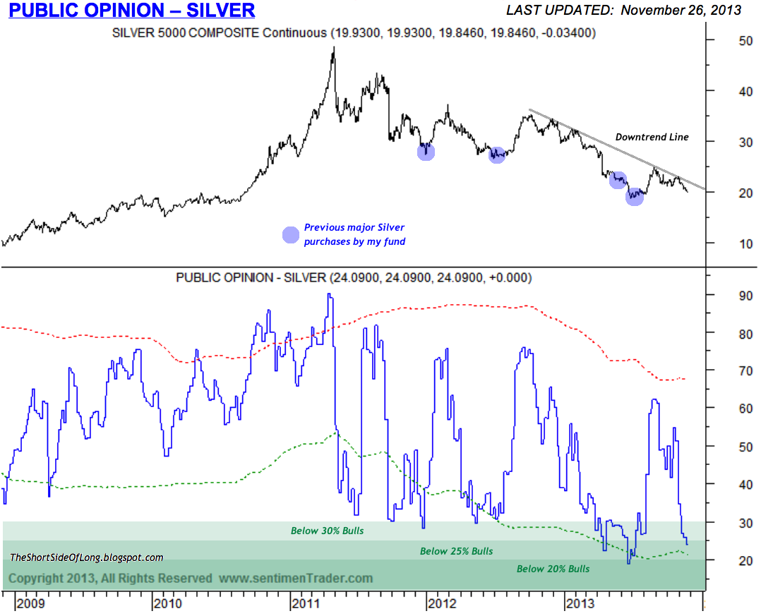 With Public Opinion sentiment dropping below 30% bulls, and furthermore in recent weeks below 25% bulls, I have started paying attention to Silver again as a potential buying opportunity (by the way… there are many other indicators I track including COT futures positioning, option positioning, Gold miners breadth, annualised performance, premium / discount in popular ETFs, fund flows, bear market analogues and so forth).