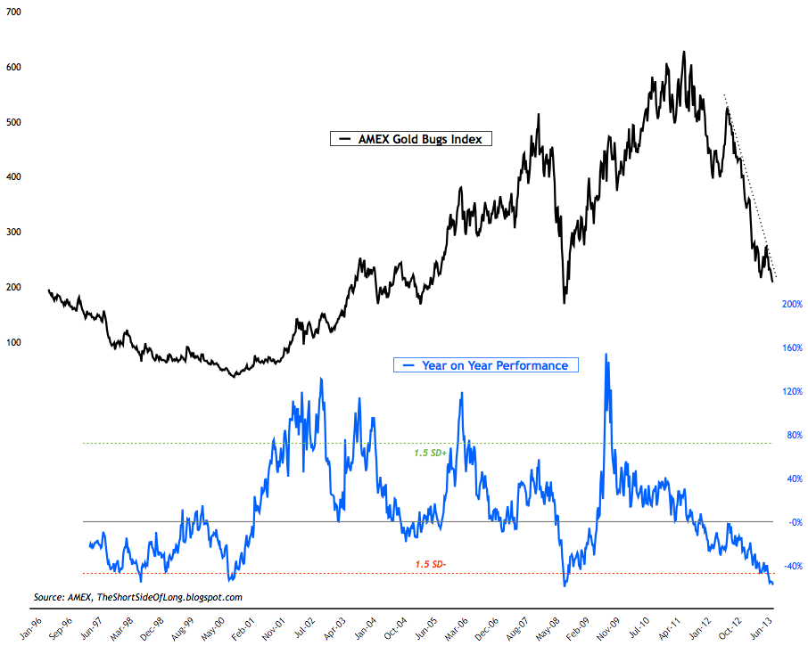 However, do note that this type of oversold level can persist for awhile longer, because the anomaly was how hard Gold rallied throughout the 2000s. Mean reversions don’t stop at equilibriums, as the markets always overshoot or undershoot. Having said that, these types of oversold conditions are over 2 standard deviations away from the multi-decade mean and rarely continue for a prolonged period. Usually the mean reversion occurs in the opposite direction as a major rallies occur from oversold levels.