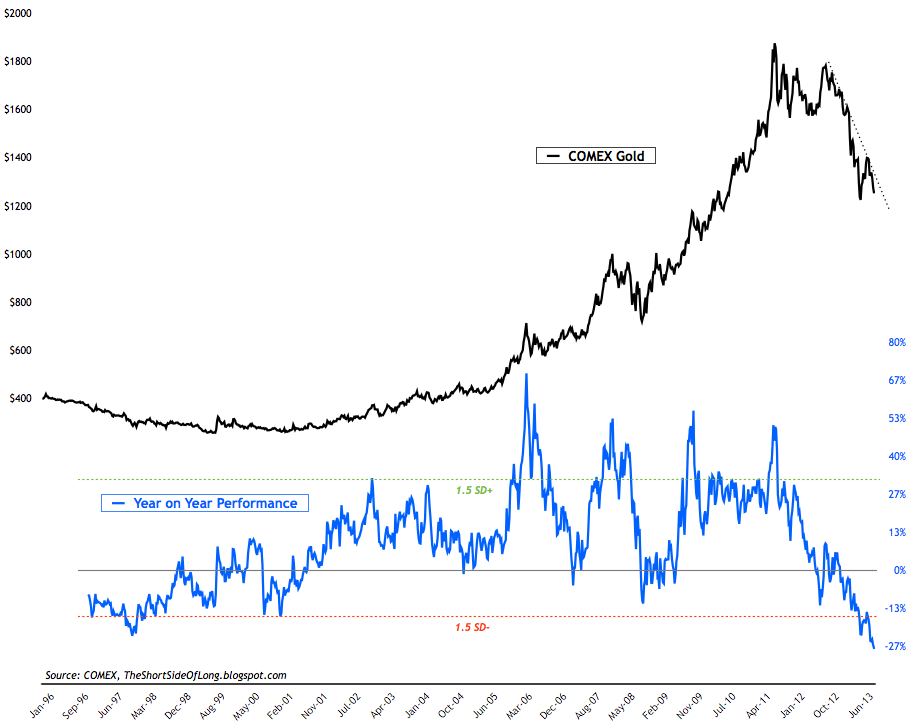With such a strong run up, a possibility of a proper mean reversion was always in the cards. And mean reversion is what we are getting right now. Looking at the chart above, Gold is now down over 27% (including today’s decline) over the last 52 weeks, which is the worst annualised performance since 1985.
