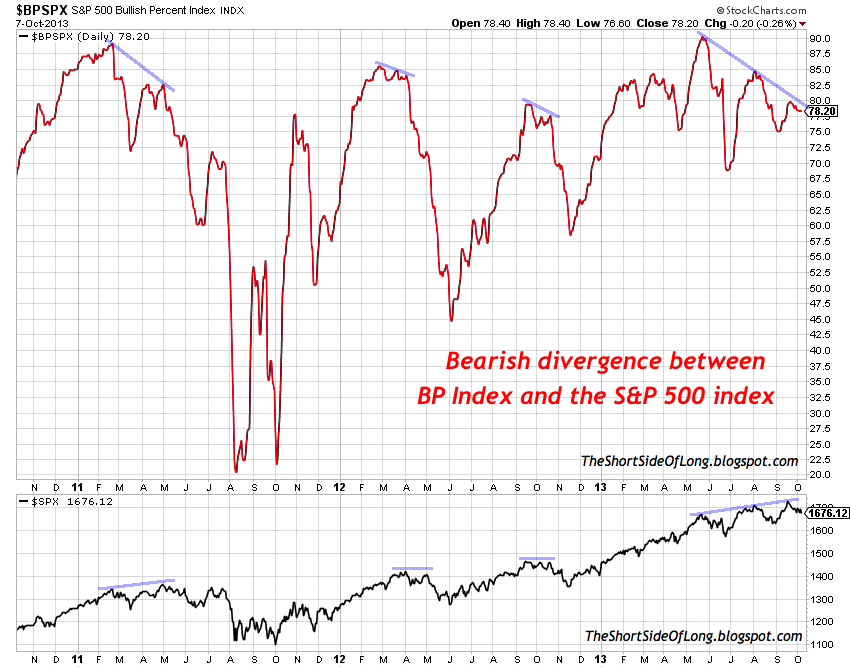 As we know, near market peaks, certain stocks tend to start breaking down before the overall index turns down too. This indicator is a perfect example of that happening, whether it was intermediate peaks in April 2012 and October 2012; or whether it is major peak in early to mid part of 2011. Are we looking at another major peak? bearish divergence has been going on for several months now, so pay close attention.