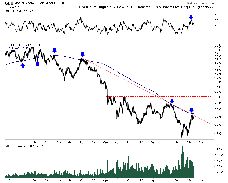 The daily line chart of GDX (large gold miners) is below. GDX has consolidated below a confluence of major resistance for several weeks and has held in well. The 400-day moving average has marked each important top since 2012 while the trendline dates back almost as far. A confirmed break above the trendline would bring targets of $27.50 (21% upside) and $30.00 (25% upside) into play. A break above an RSI of 70 would signal sustained positive momentum and offer strong confirmation of the breakout. GDX has strong support at $20.50.