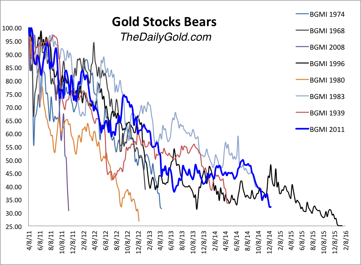 Another December and gold stocks have reached another extreme oversold condition. This was the case precisely 365 days ago and the precious metals complex, led by the miners rebounded strongly for nearly three months. A year later and the gold stocks are even more oversold. They’ve been in a bear market for more than three and a half years and in terms of price are very close to matching the worst bear market of all 1996-2000. Only time will tell if this is truly the end of the bear market but in any case miners have a shot to start 2015 off positively.