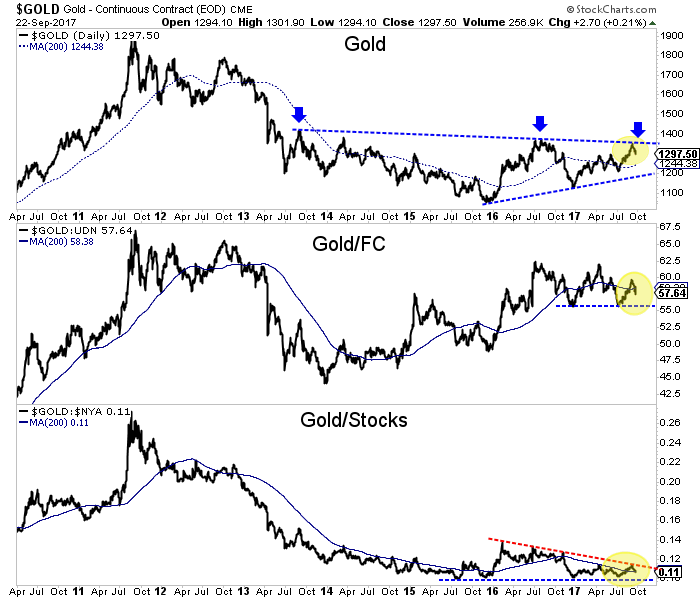 In recent weeks both metals and miners have declined somewhat sharply after reaching resistance. Gold peaked just below major resistance near $1375/oz and GDX, the biggest ETF for gold miners peaked at its October 2016 and February 2017 highs. If precious metals can break through this resistance then a major move higher would begin. However, the recent selloff, coupled with a lack of relative strength suggests the road to a breakout could lead well into 2018.