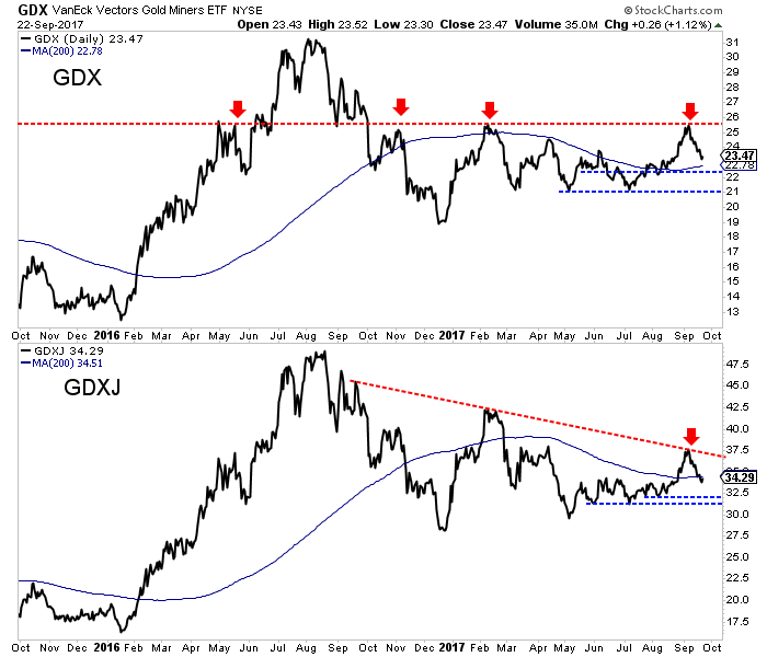 While Gold could eventually be headed for a major breakout (potentially in 2018) the road ahead could be difficult. A breakout anytime soon is unlikely. The relative weakness of the sector in the face of a weak US Dollar and the inability to hold gains into the end of the quarter suggests that Gold and gold stocks will remain mired in their long-term bottoming patterns. As we noted several weeks ago, we want to continue to accumulate the best opportunities in juniors on weakness. That is what we have done since last December and it has served us well. To find out the best buys right now and our favorite juniors for 2018, consider learning more about our premium service.
