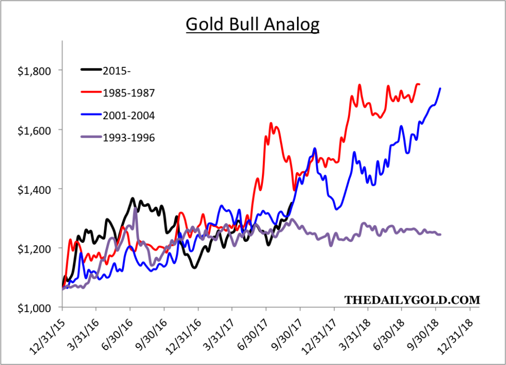 We started employing analog charts during the latter stages of the seemingly forever bear market in precious metals. Comparing current to past trends by using price data is not considered technical analysis but it is extremely valuable because history tends to repeat itself. It also helps us identify extremes as well as opportunities. For example, in 2015 it was clear the epic bear market in gold stocks was due for a major reversal. Today, precious metals appear to be in the early innings of a cyclical bull market and the analogs suggest there is plenty of room to run to the upside.