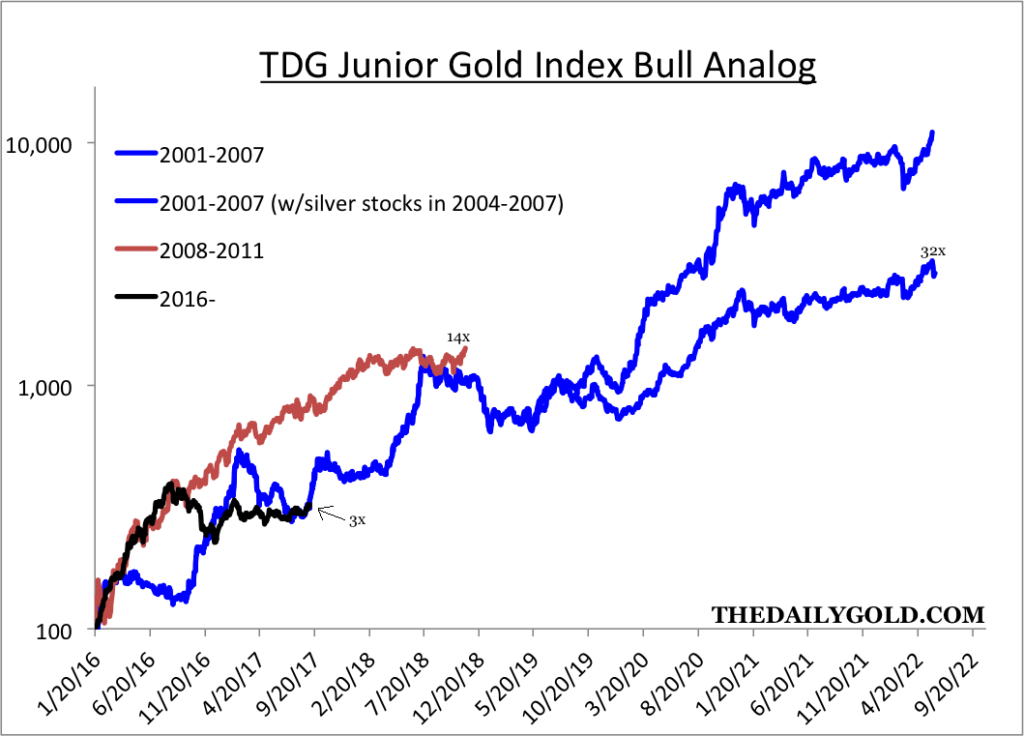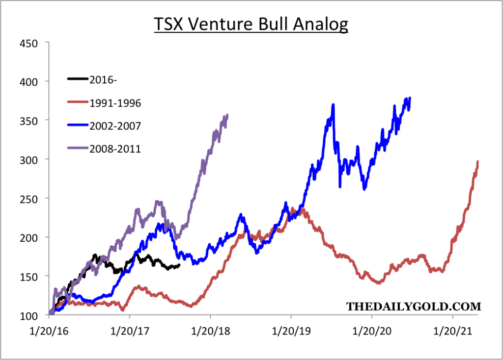 Next is an analog constructed from data from my custom junior gold indices. The juniors are currently right at the point where the 2001-2007 bull made a massive move higher over the next 12 months. The two bulls for comparison are a very long cycle (+6 years and less than 3 years). At worst, I’d expect this bull to last somewhere in between. If Gold makes a clean break above $1375/oz then I’d expect this bull to advance to the 14x peak the other bulls achieved before 2019.