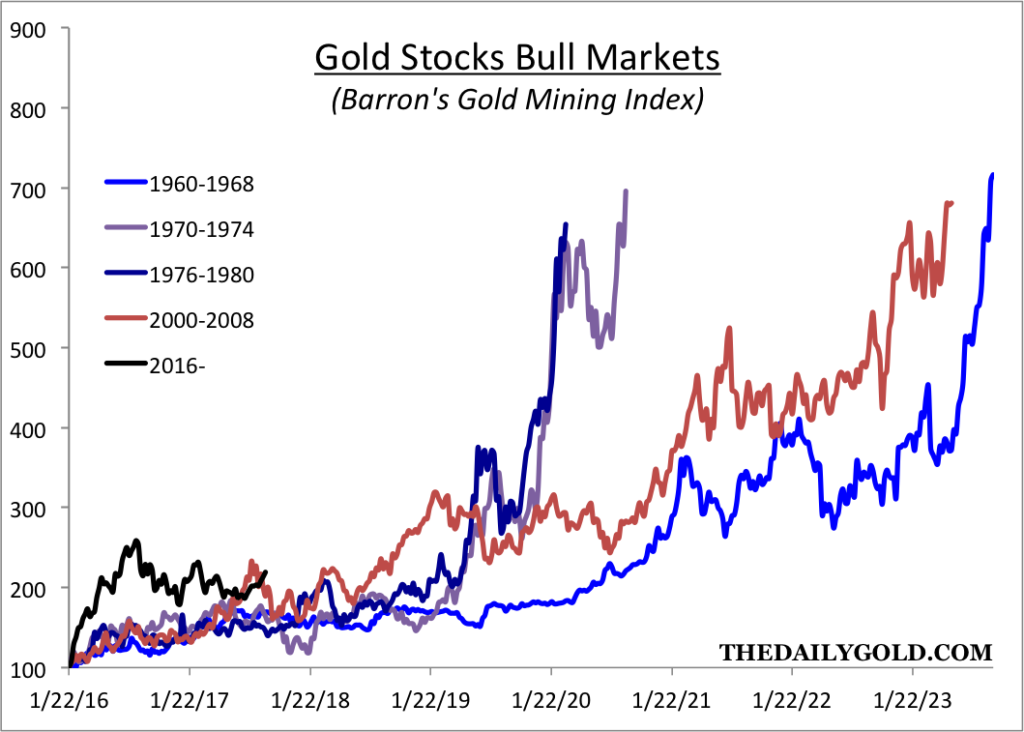 Next we look at the large cap gold stocks. The data is from the Barron’s Gold Mining Index (BGMI) which is one of the few indices with a multi-decade history. If one were to look at the HUI or GDM (parent index of GDX) it would show the gold stocks are currently behind the rebound that began in the fourth quarters of 2000 and 2008. Data from the BGMI implies the rebound in gold stocks is ahead of schedule. In a broader sense, the BGMI certainly has plenty of room to run as many of its bull markets have achieved 7-fold returns.