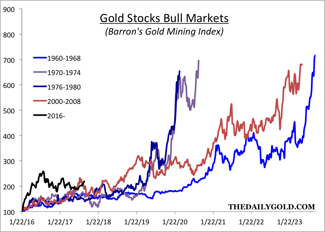 The analogs show that the current bull market in Gold, gold stocks and juniors is obviously in the early innings in both time and price. Interestingly, the analog for Gold and the junior gold stocks suggests there is the possibility of strong upside potential over the next 12 months. If Gold breaks above major resistance around $1375/oz, then the juniors and large gold stocks could realize that upside potential over the next 18 months. Although the fledgling correction in precious metals could continue and expand, the broader risk to reward is skewed to the upside. Therefore, we want to accumulate the best opportunities in the juniors on weakness. To find out the best buys right now and our favorite juniors for 2018, consider learning more about our premium service.
