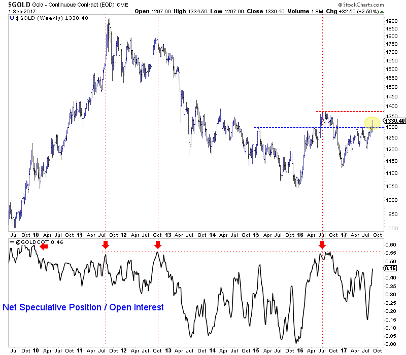 The breakout in Gold through $1300/oz has sparked the miners and juniors and we expect additional gains in the short-term as Gold has room to run. That being said, do note that the net speculative position in Gold is fairly high. It could reach an extreme level if Gold tests major resistance around $1375/oz. To find out the best buys right now and our favorite juniors for 2018 consider learning more about our premium service.