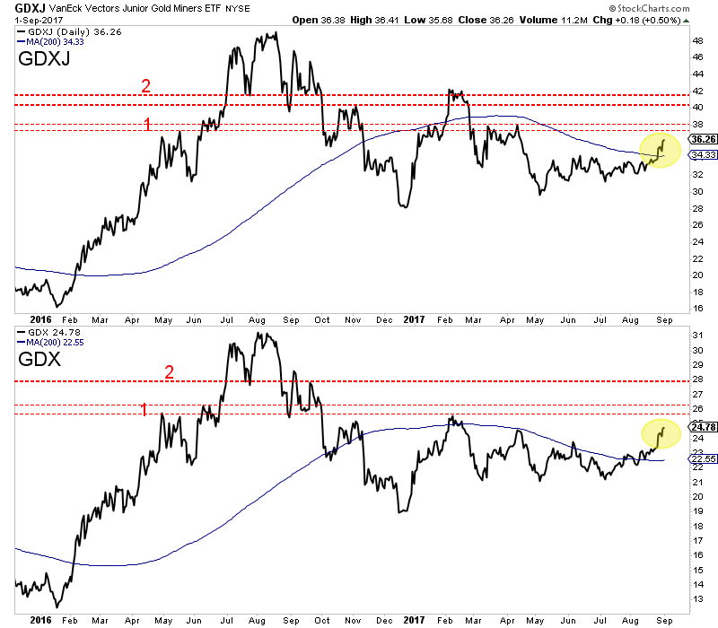 Circling back to the stocks, we see that our mini-GDXJ index, which consists of 26 stocks and has a median market cap of ~$100 Million closed the week at a +6 month high. The exploration juniors have led the entire sector this year and we expect that to continue. The price action is healthy as the index is trading above its 50-day, 200-day and 400-day moving averages which are all sloping higher. The index closed at 206 and should reach resistance at 215-220. A correction from there (perhaps in October) could setup a push to the 2016 high.