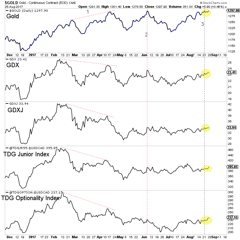 In the chart below we plot a number of markets including Gold, GDX, GDXJ, our 55-stock junior index and our optionality index. We marked three points that help inform our analysis.