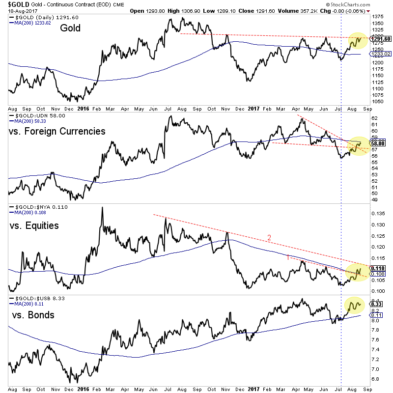 The US$ index has enjoyed only a slight rebound but Gold has maintained its 2017 US$ weakness induced gains because of its strong relative performance. Below we plot the daily line chart of Gold and a number of ratios: Gold against foreign currencies (Gold/FC), Gold against Equities and Gold against Bonds. Since the July low, Gold has showed good nominal and relative performance.