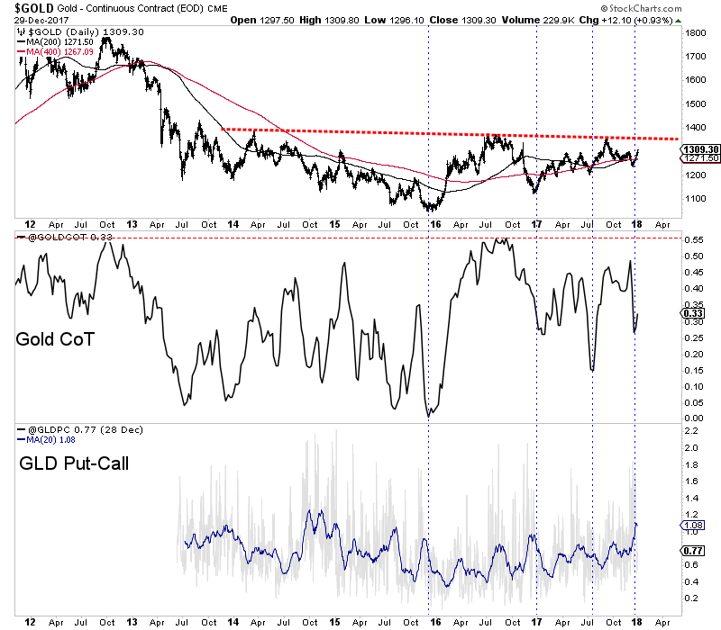 Gold is much closer to breaking its 2016 high than the miners but the miners could begin to sniff that potential breakout in Gold before or as it happens. Gold recently bottomed around $1240 with sentiment indicators at encouraging levels. In the chart below we plot Gold along with its net speculative position as a percentage of open interest (CoT) and the GLD put-call ratio. The CoT recently touched 27% which, although not a bearish extreme is fairly low relative to most readings since February 2016. The GLD put-call ratio recently touched the highest level in more than two years. With current sentiment relatively muted, Gold has a chance to rally up to trendline resistance. That would put it in position to breakout sometime in 2018.