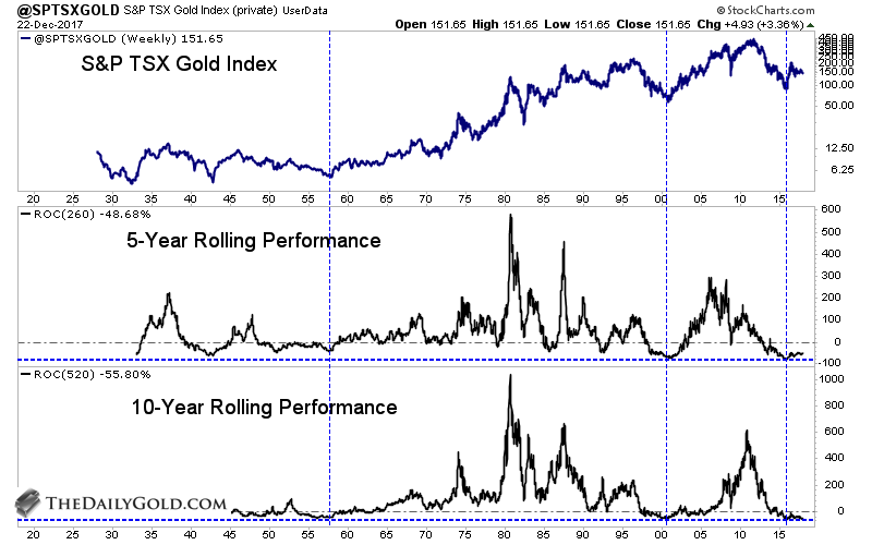 First, we focus on the long-term rolling performance in the gold stocks. The chart below plots the S&P TSX Gold Index (data obtained from Global Financial Data) along with its rolling 5-year and 10-year performance. By that metric, the gold stocks (going back +80 years) were the most oversold in late 2000 and early 2016. If we were to run a 15-year and 20-year rolling performance then the three most oversold periods would be late 2000, early 2016 and the late 1950s. The gold stocks enjoyed massive long-term returns from the late 1950s and the year 2000.