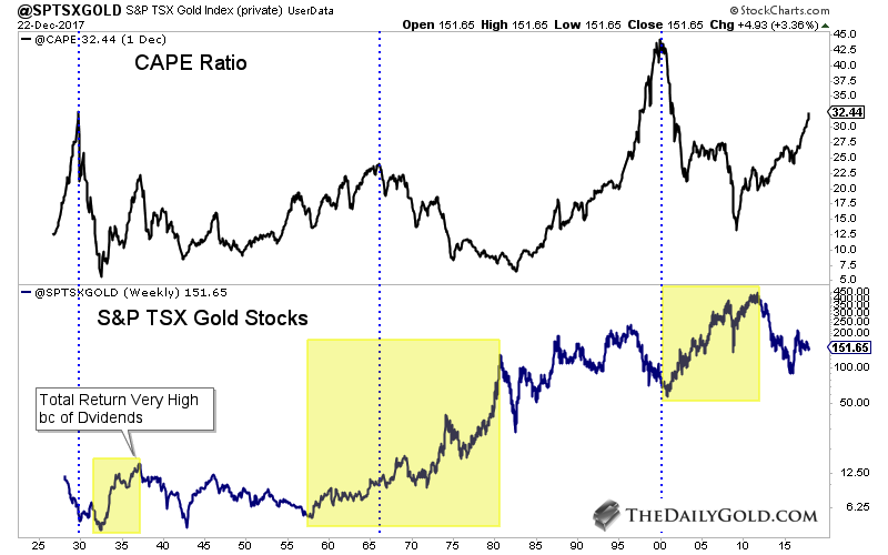 Next is one of my favorite charts. We compare the valuation in the stock market with the performance in the gold stocks. We plot the CAPE Ratio along with the S&P TSX Gold Index. The gold stocks performed fabulously after the CAPE Ratio reached major peaks in 1929, 1966 and 2000. The gold stocks bottomed several years prior to the CAPE peak in 1966 and perhaps we are seeing a repeat of that now. The gold stocks bottomed in early 2016 though the CAPE ratio has continued to rise. We hear plenty of talk about future returns being very low and there being no place to invest. To that, I present this chart!
