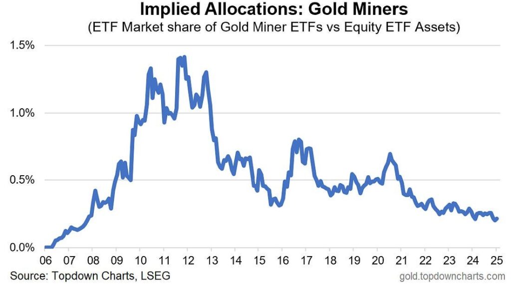 Assets in all gold miner ETFs relative to all ETF assets in stocks are near a 20-year low! This is a staggering statistic for a sector that has increased 50% in the last 12 months.
