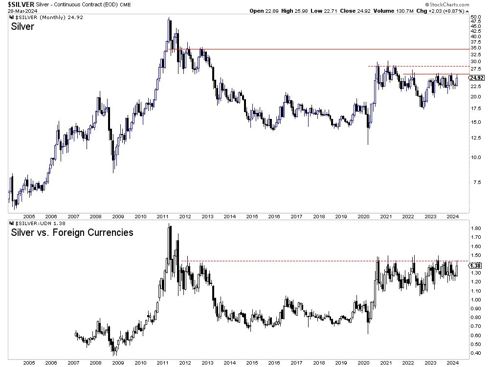 Silver against foreign currencies is battling resistance that dates back to 2012. A breakout puts it in a good position to move towards the all-time high.