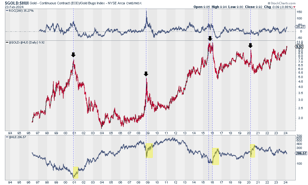 We plot the inverse (Gold divided by the HUI) and the HUI at the bottom. Sharp rises in the Gold to HUI ratio typically precede major lows and huge rebounds in the gold stocks.