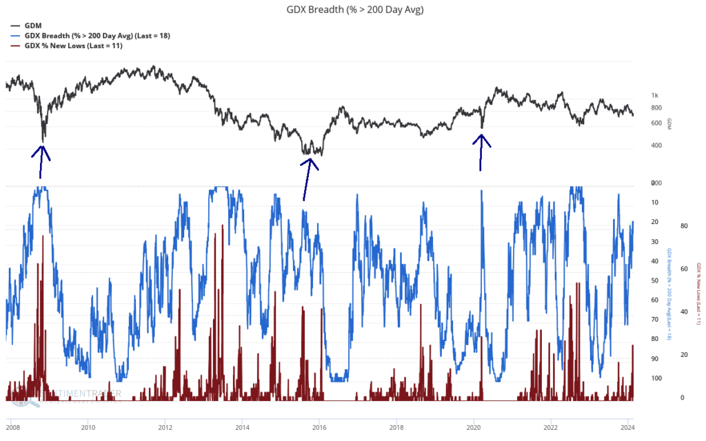 The chart below plots GDX (black), new 52-week lows (brown), and the percentage of GDX stocks trading above the 200-day moving average (blue).