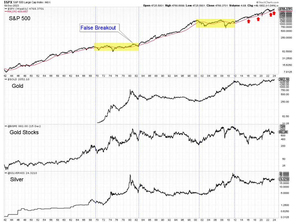 The stock market should outperform Gold into the first quarter of 2024. Breadth indicators are strong, the market has momentum, and Fed policy is now supportive. The setup exists for a strong move and a potential major top on the other end (if there will be a recession in 2024).