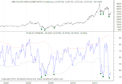 Silver Public Opinion, a grouping of all major sentiment survey’s, is thanks to SentimentTrader website. I have to admit, when one looks at the chart above, one should really get a strong urge to buy Silver – I do everyday. Majority are bearish on this asset with passion… they really really hate it. They have hated it since it first started collapsing in early June and apart from a little pause in between, they are back to being overly negative about it. The recent sell off in late September, pushed this sentiment reading to a record low. That means we know have more bears than in October 2008 and yet the price is 3 times higher.