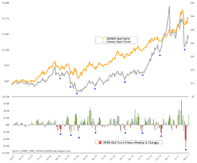 I tend to use GLD weekly dollar change fund flows for both Gold and Silver. I do have data from other ETFs including SLV flows, but it does not work anywhere as good. Besides, Gold and Silver have an amazingly high correlation, so it is pretty useful for both assets. Looking at the chart above, coming into late September, GLD suffered a record weekly outflow two weeks in the row. This was a selling climax or a panic or fear or whatever you want to call it. Previous outflows only half of the recent amount have resulted in intermediate bottoms, so it is safe to assume this time will not be different. We could be in for one more sell off for a retest of lows. If that happens, jump in with both hands and feet against the crowd!
