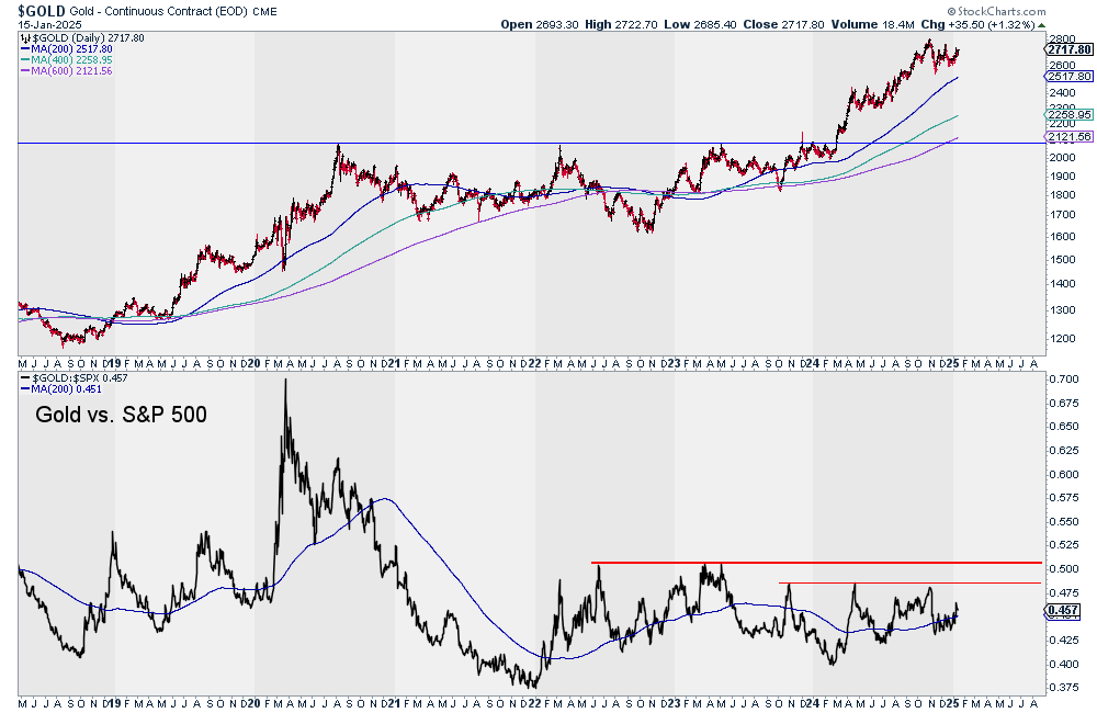 Gold cannot surge from its 10-year-long base against the 60/40 Portfolio without outperforming stocks. Surpassing 0.50 and sustaining it should set the stage for a major leg higher in the entire sector.