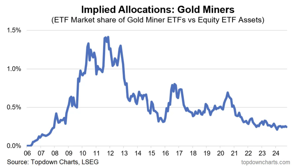 The chart below plots the assets of gold miner ETFs relative to the assets of all stock ETFs.