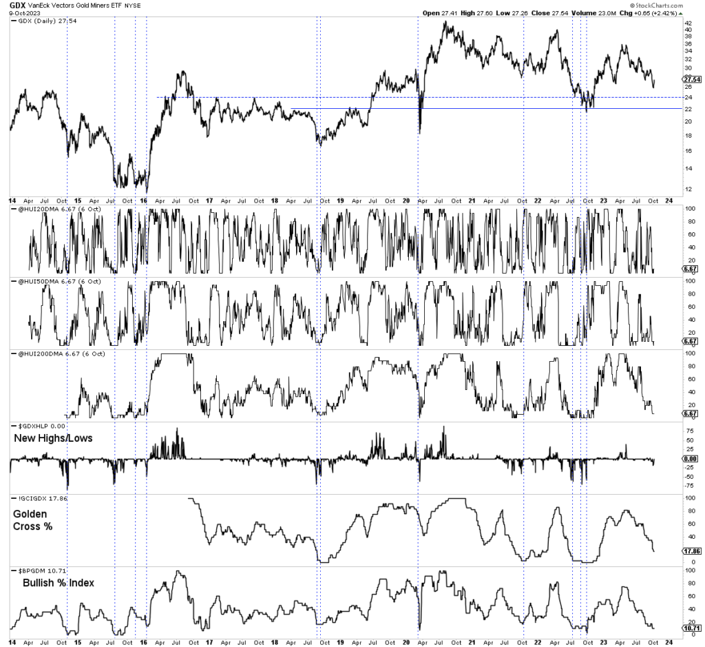 In the first chart, we plot GDX and six different breadth indicators. The first three show the percentage of miners (in the HUI index) that closed above the 20-day, 50-day, and 200-day moving averages. The last three show the percentage of new highs or new lows in GDX, the percentage of GDX stocks in which the 50-day moving average is above the 200-day moving average (Golden Cross), and the percentage of GDX stocks on a point and figure chart buy signal.